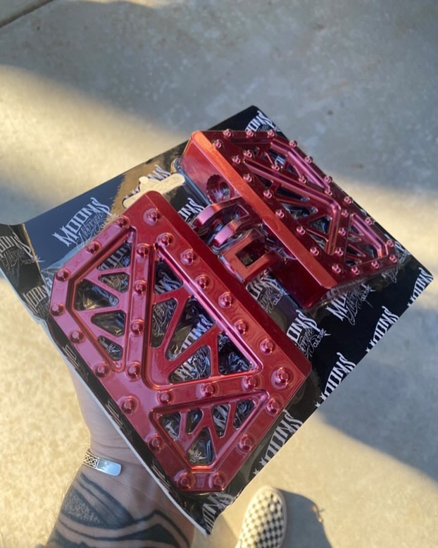 Brand new Moons MC Red Mini Floorboards still in the box. Fits all m8 softails with peg mounts.